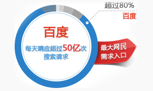 当您找客户时,您的客户也在百度找您 在百度,平均每天有 约228万次农林牧渔类信息搜索约355万次建筑及装修类信息搜索 约695万次机械设备类信息搜索约127万次旅游及票务类信息搜索 约1343万次商务服务类信息搜索约2807万次图书音像类信息搜索 ..... 百度是全球最大的中文搜索引擎,占据超过80%的中国搜索市场份额,超过5亿中国网民已经习惯了在有需求时"百度一下"!
